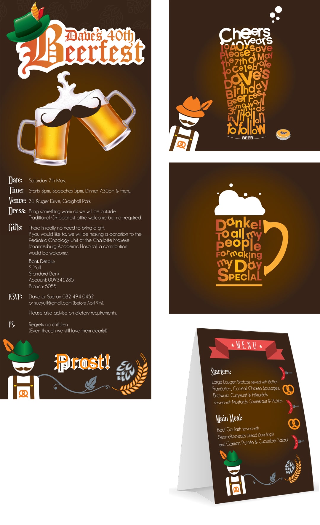 Birthday Event Design: 40th Birthday Oktoberfest Theme Elements | Save the Date Emailer | Thank You Emailer | Invitation Emailer | Tent Card Table Menu
