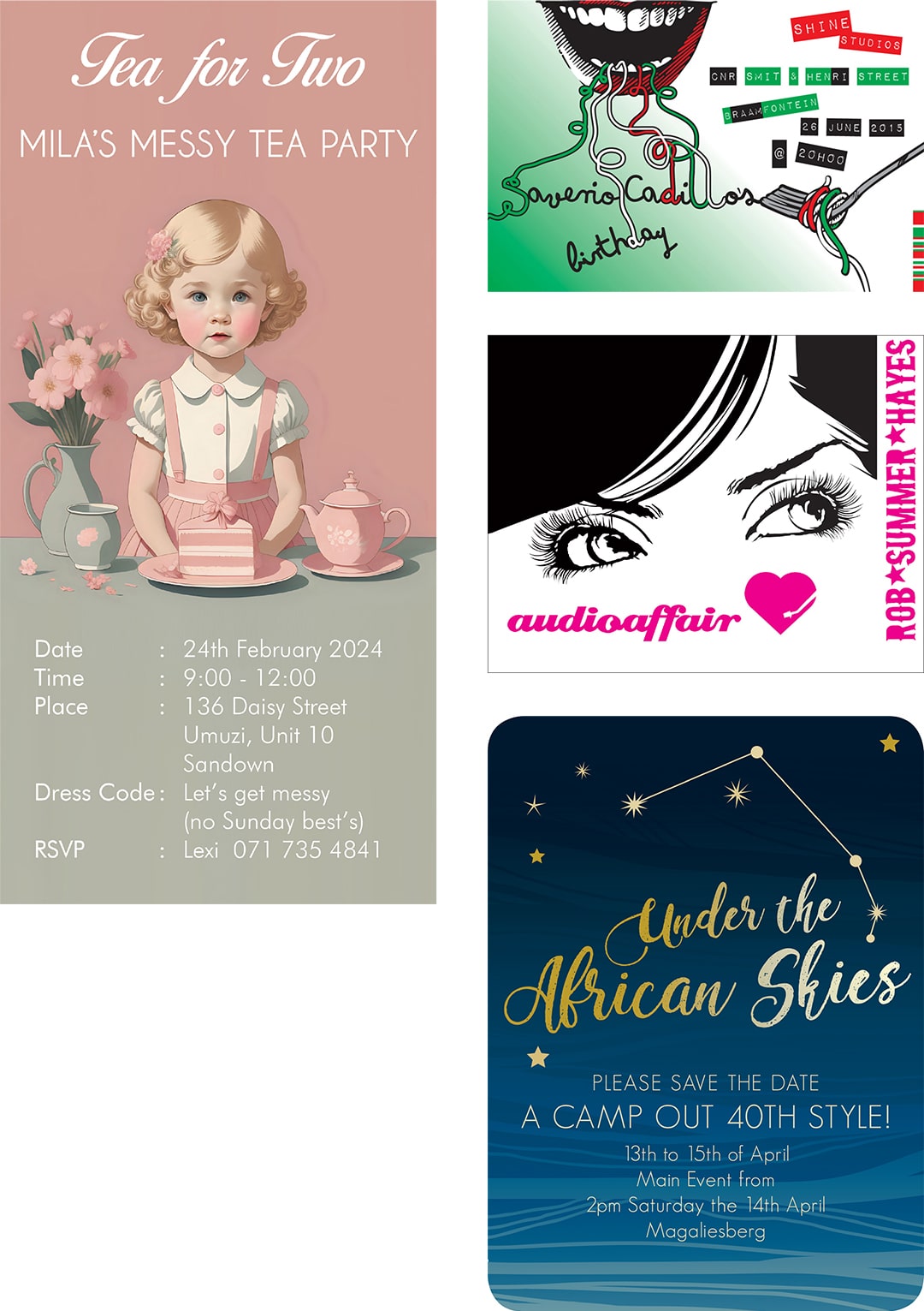 Invitation Design: 2nd Birthday Party: Tea For Two Theme  |  Restaurateur’s Birthday: Italian Theme |  Audio Affair Event Teaser: DJ Rob Summer Hayes  |  40th Birthday: Camp Out Theme